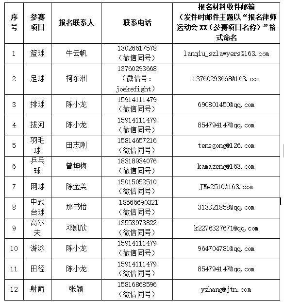 请符合报名条件的人员以律师所为单位,于2025年10月 31 日18:00前将上述报名材料通过邮件发送至以下对应比赛项目联系人的收件邮箱:
