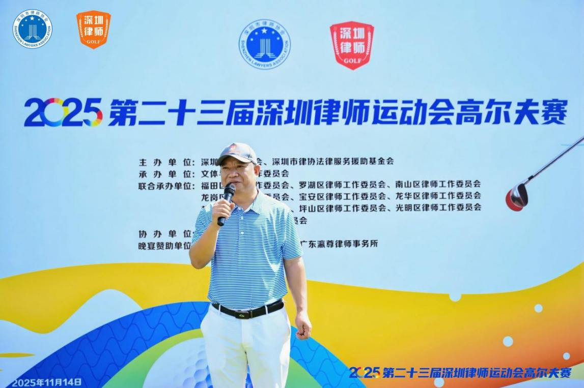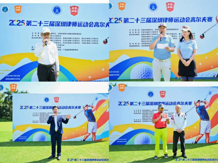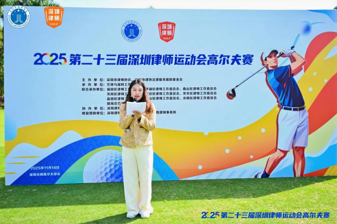 2025年11月14日,由深圳市律师协会、深圳市律协法律服务援助基金会主办,深圳市律师协会文体与福利工作委员会(以下简称“文体委”)、福田区律师工作委员会、罗湖区律师工作委员会、南山区律师工作委员会、龙岗区律师工作委员会、宝安区律师工作委员会、龙华区律师工作委员会、盐田区律师工作委员会、坪山区律师工作委员会、光明区律师工作委员会,前海合作区律师工作委员会联合承办的第二十三届深圳律师运动会高尔夫赛在深圳市光明区光明高尔夫球会成功举办。深圳市律师协会文体委主任团队部分成员,光明区律工委代表,深圳律师高尔夫俱乐部理事成员及赞助单位广东瀛尊律师事务所代表等人员参加了赛事开幕式。本次赛事开幕式由文体委秘书长邓凤英律师主持。