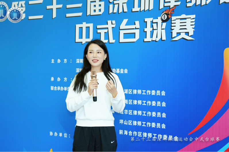 邓凤英秘书长代表文体委为本次赛事致辞,传达了文体委对本次赛事的美好祝愿,回顾了历届深圳律师运动会及台球赛事的发展历程,每一场比赛所传递的友谊、拼搏与合作精神,都是深圳律师行业凝聚力与文化建设的重要象征;希望各支参赛队伍都能展现风采、共创佳绩。