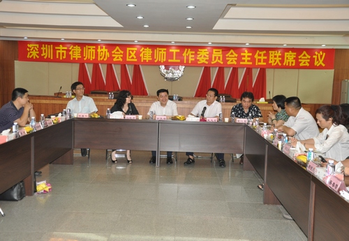 5 月13日 下午,市律协区律师工作委员会主任联席会议在宝安区司法局会议室举行。市律协会长余俊福、监事长张善华、市司法局律管处调研员史志宏、宝安区司法局副局长马晓燕、市律协副会长蔺晓青、秘书长刘守华、各区司法局公律科科长及市律协各区律师工作委员会主任、副主任等二十多人参加了会议。