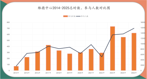 数据还揭示出志愿服务的深层结构:仅占总数14.55%的102位核心志愿者(年服务时长≥30小时),贡献了总时长64.29%的服务,共计8978.3小时。这一分布凸显了公益生态的一个关键特征——少数人的长期坚守,往往构成了服务延续的中坚力量。
