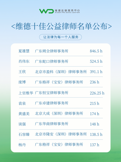 广东朔全律师事务所夏雄慧律师:以全年846.5小时的非凡成绩成为标杆。她长期值守维德法律咨询热线,并深入新疆喀什等地开展宪法、反欺凌等主题普法,为未成年人提供案件代理等法律援助,展现了跨地域、跨领域服务的公益热情与专业精神。