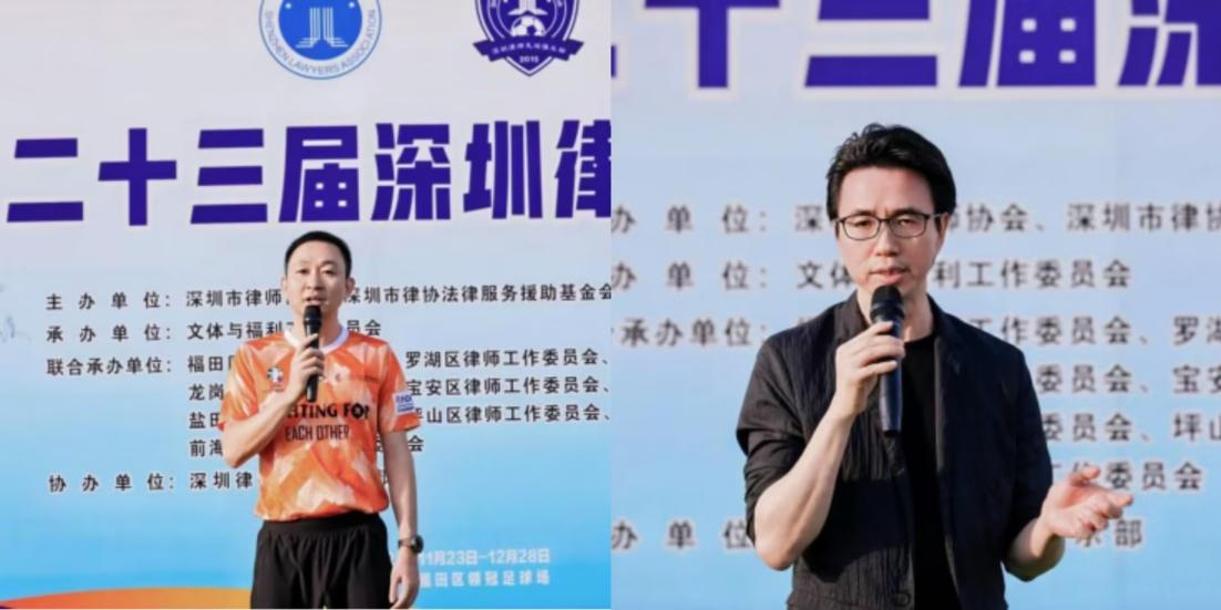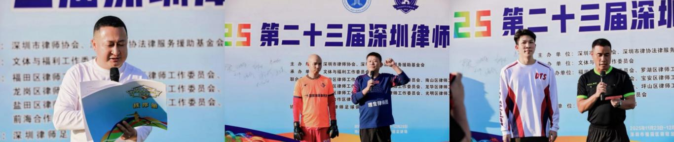 2025年11月23日-12月28日,由深圳市律师协会、深圳市律协法律服务援助基金会主办,深圳市律师协会文体与福利工作委员会、福田区律师工作委员会、罗湖区律师工作委员会、南山区律师工作委员会、龙岗区律师工作委员会、宝安区律师工作委员会、龙华区律师工作委员会、盐田区律师工作委员会、坪山区律师工作委员会、光明区律师工作委员会、前海合作区律师工作委员会联合承办,深圳律师足球俱乐部协办的第二十三届深圳律师运动会足球赛在深圳市福田区领冠足球场成功举办。深圳市福田区司法局二级调研员罗展,深圳市律师协会副会长王伟,理事孙春桥、潘春明、文体委主任团队部分成员、龙岗区律工委代表、深圳律师足球俱乐部理事会部分成员参加了赛事开幕式。本次赛事开幕式由文体委秘书长邓凤英律师主持。
