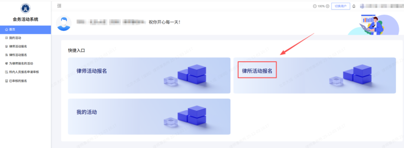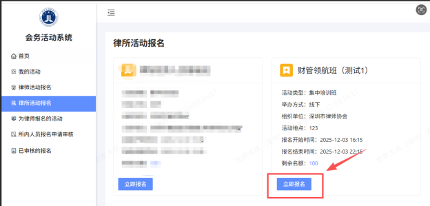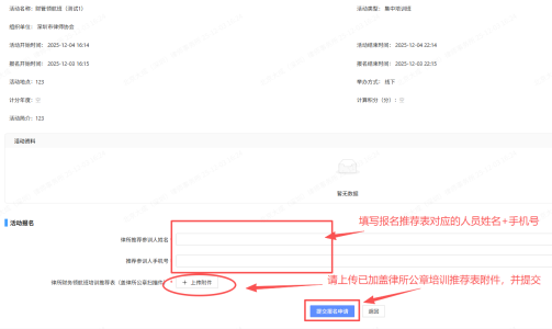 请以律所账号登录会员系统,进入“律所活动”报名系统(提交推荐参训人员信息,限1人),按以下指引填写报名信息。