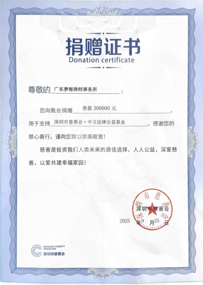 近日,广东梦海律师事务所向深圳市慈善会捐赠300000元用于支持法律公益事业。