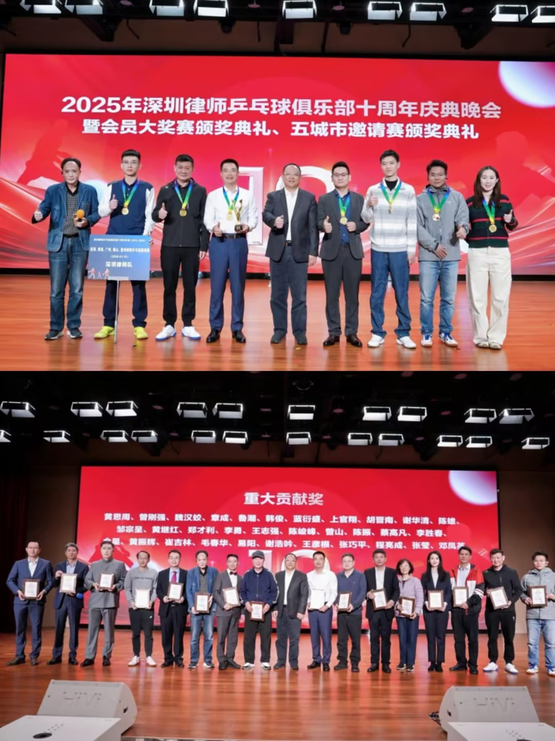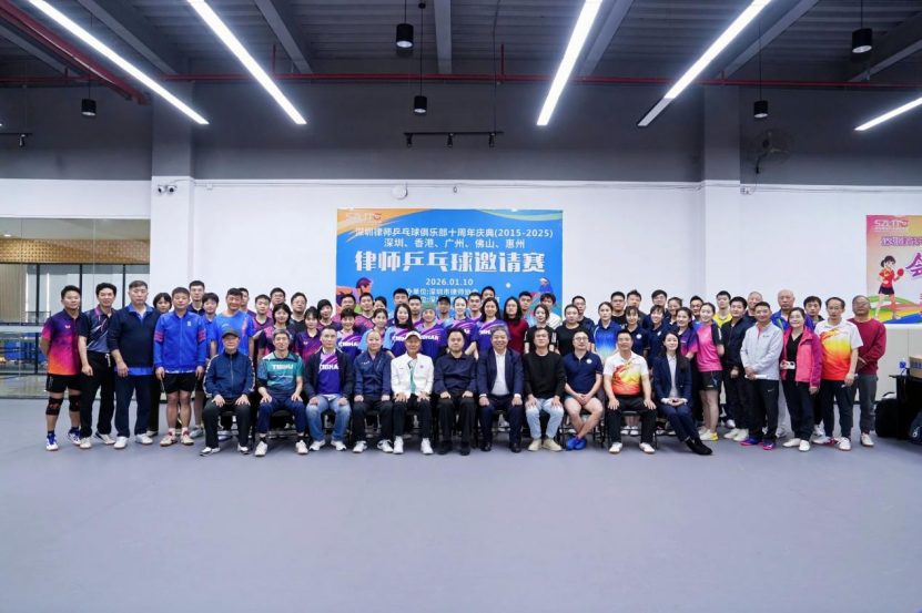 2026年1月10日,由深圳市律师协会主办、深圳律师乒乓球俱乐部承办的深圳、香港、广州、佛山、惠州五城律师乒乓球邀请赛暨深圳律师乒乓球俱乐部十周年庆典活动在深圳美中俱乐部成功举办。深圳市司法局原局长蒋溪林,深圳律协副会长章成、黄远兵,佛山律协监事长纪建斌、副会长冼璈隆,惠州律协副会长戴秋生,广州律协文体委副主任赵晓飞,香港律师乒乓球队领队石川,广东省律师协会名誉会长、深圳律师乒乓球俱乐部主席黄思周、荣誉主席陈峻峰、黄振辉,理事长谢华清,俱乐部荣誉理事长邹宗呈等嘉宾,市律协文体委主任团队部分成员,以及“五地”律师代表队队员参加本次活动。本次赛事开幕式由深圳律师乒乓球俱乐部副理事长金星主持。