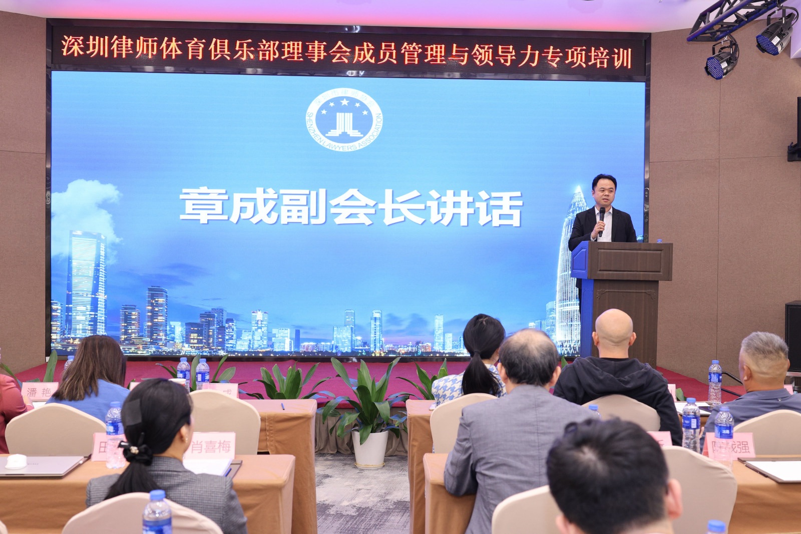 章成副会长发表培训工作讲话,并介绍了目前深圳市律师行业发展基本情况及市律协对深圳律师文体工作的支持。他表示,希望各深圳律师体育俱乐部充分利用市律协平台的各种资源,发展各个体育运动项目的同时带动深圳行业发展;勇于承担深圳律师体育工作责任与担当;创新与引领深圳律师运动会品牌体育事业迈向新阶段;带领深圳律师体育俱乐部体系化与长效性建设;以体育工作为载体向深圳律师行业高质量发展作积极奉献。